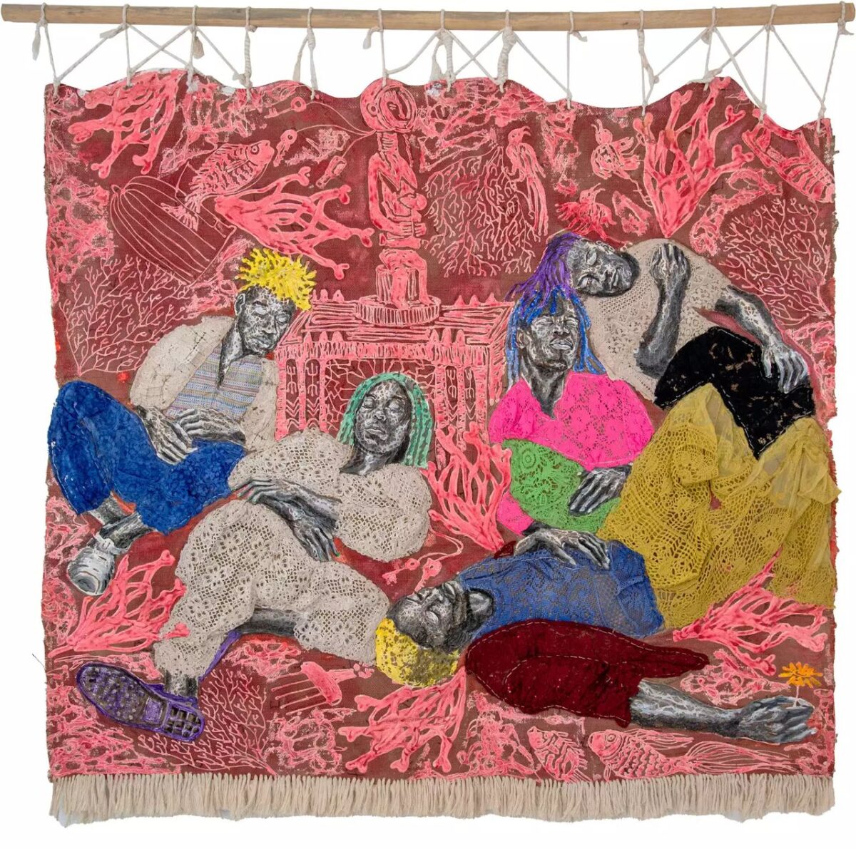 Son langage visuel, nourri par l’artisanat, la calligraphie et la sérigraphie, se distingue par sa profondeur sensible et conceptuelle. Il peint souvent sur toile de jute et intègre des motifs récurrents tels qu’autels, figures humaines et objets du quotidien. Chaque œuvre naît d’un rituel d’écriture secrète guidant la composition. Ses scènes cosmiques recentrent les corps afro-descendants.