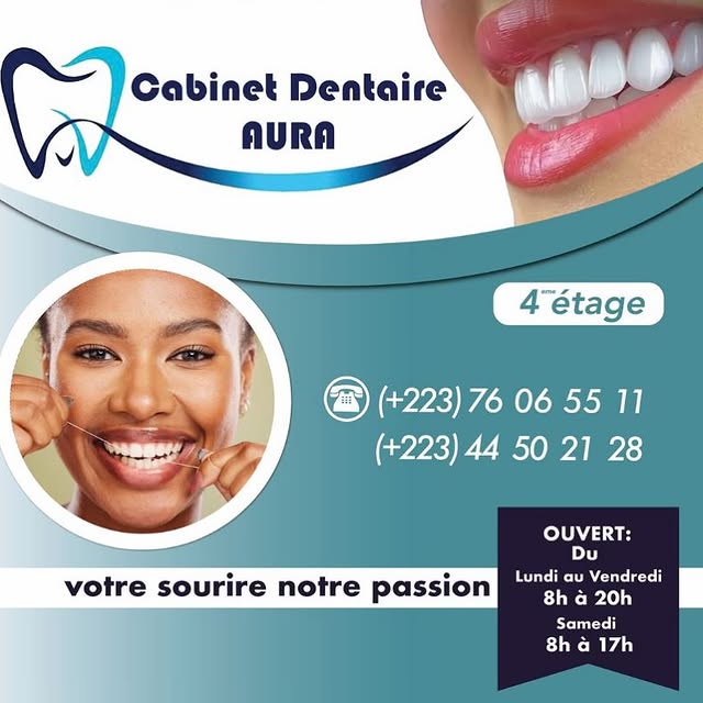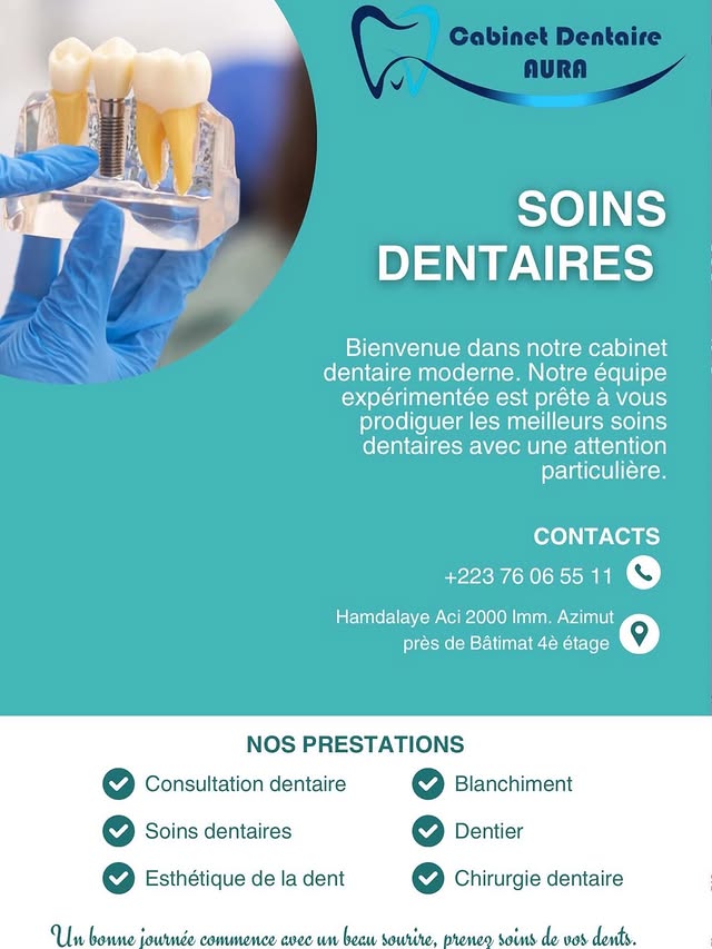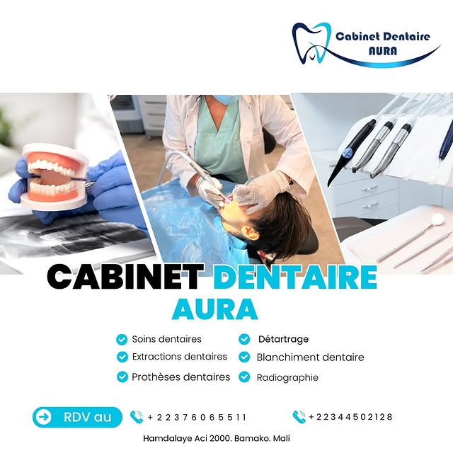 Situé dans le quartier de Hamdallaye à Bamako, le Cabinet Dentaire Aura est une structure de soins moderne dédiée à l’excellence en santé bucco-dentaire au Mali. Notre cabinet accueille les patients de tous âges dans un cadre professionnel et chaleureux, avec l’ambition d’offrir des soins aux standards internationaux accessibles à tous.