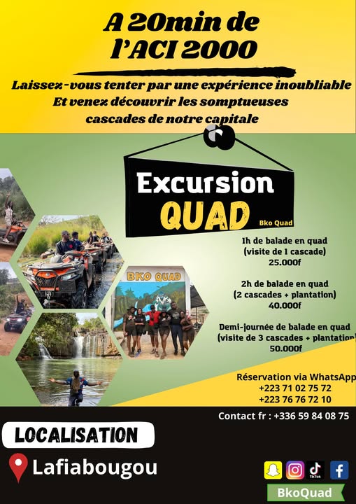 Bko Quad vous invite à vivre une expérience d’aventure unique à Koninbabougou avec des activités adaptées à tous les âges. Profitez d’excursions en quad pour adultes, de parcours sécurisés spécialement conçus pour les enfants, ainsi que de balades et excursions à vélo pour découvrir autrement les paysages naturels de Bamako.